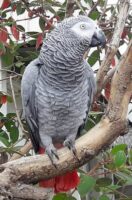 Medium sized African Grey (with orange tail). Female. Has metal I.d. Band on her ankle.