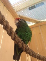 She is a medium sized green Jardine’s Parrot. She flew out of our home at 1716 Brockton Ave on 7/1/15 at 8pm when a door was left open. She flew north east. She was spotted in a tree at Iowa and Westgate. but panicked and flew north east again. She was spotted the following morning in a very tall tree on Idaho and Granville.