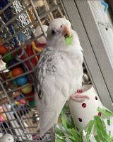 Minnie is two years old. White cockatiel with grey markings on her wings and face. She’s clicker trained and knows her name.