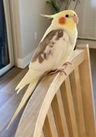 About 7 inches from head to tail, light yellow, grey spots on back, band around leg, red cheeks