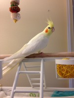 Very friendly lutino cockatiel (white, with yellow head and tail, orange cheek patches). She has chronic health problems and is dearly missed.