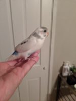 White with a blue belly, little grey pattern that looks like tiny wings on back wings.