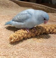 Very light blue parrotlet with grey and white scalloping on his wings. He is very friendly, 6 months old in April 2020. He should step up readily. He flew out the back door unexpectedly. Most likely will come to people easily! He responds to human voices especially high pitched voices, he responds to his name usually.