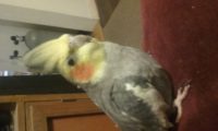 Male Grey Cockatiel named Leo. Tame and finger trained. Whistles and talks some. Says hello, whats going on, hey baby. Seven blacks toenails, one white.