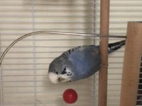 Blue English Budgie flew off during wind storm on Venice Drive and Chanticleer Avenue. English Budgies have an angry looking face because of feather arrangement around eyes. Young bird with not much flying experience.