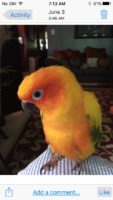Very people friendly, will step up on command to anyone. Likes to hide will only eat bird food. Like dried fruit and some nuts especially partial to sunflower seeds. Will call with with loud Conure screeching Sometimes in groups of three. Especially noisy in the morning. He is my best friend and I really miss him.