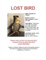 my friend has lost her precious pet cockatiel ‘Aramis’ (aka. Mishy).