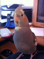 1 year old cockatiel with white wings. Very friendly male who asks “whatcha doin’?” and “Pretty bird”. When he wants out starts demanding “Come here Spiky” Can whistle Star Wars Imperial March and Happy When You Know It.