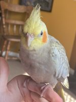 Murphy loves chips and millet, he’s barely a tweenage bird and CURRENTLY has pin feathers on his head and neck. He responds to flock calls and loves neck pets.