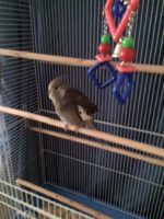 Moo is about 2 years old. She is friendly and will try to land on your head or back. She will not hurt you.