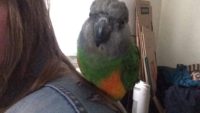 Sunny escaped out of the door on the evening of may 27, 2017. We had him in our sight until the morning of Monday, may 29, 2017. He was attacked by 2 crows and flew off. We combed the area with no luck. He is a Senegal parrot with a great head, green body and an orange belly. He vocalizes quite a bit…whistles, wolf whistles…He is fully flighted but does not have tail feathers.