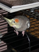 Rookie is a grey cockatiel with white markings on the wings, stripes on the chest and tail, red blush marks, and a yellow and grey crest. She does not talk, but does do the wolf whistle, except that she doesn’t really do it properly, she does the first half a dozen times and then the second half once. She’s very friendly. She will step onto your finger if you hold it out. If you’re eating she will fly over and try to eat off your plate / out of your mouth. She’s terrified of wind chimes, and scared of insects. She likes it when you whisper to her. Hates her toes or tail being touched.