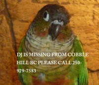 LOST Canada BC Cobble Hill yellow sided Green cheek Conure ‘DJ’ Oct 29-14