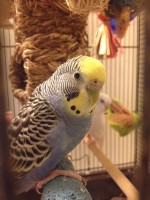 3 year old blue budgie with black and white wings/markings and a yellow face. She does not have her wings clipped and is not hand tamed.