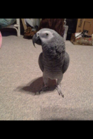 Goes by Russell. His face is white, body is grey and his tail is orange/red. Inside bird