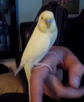 LOST Peeps is a 1 year old, male, budgie with the creamino colour mutation. His body is light yellow, his head is bright yellow, he has white cheek markings and he also has grey around his neck. His wings are not clipped. he will step on your hand or finger but quickly fly away if spooked. Peeps does NOT bite so if you can grab him PLEASE do so.