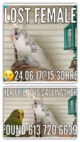 Mostly white with blue patches, female. Talker (Budgie talk – not human words) . She is a good flyer as both she & her cage friend were allowed to fly about the home daily unless they were placed outside in their cage as they were that day when the cage was blown over.