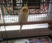 I have lost my lovely cockatiel , she is white and yellow face and orange cheek .