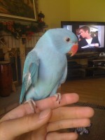 Bright red beak. Light blue feathering. Full set of tail feathers