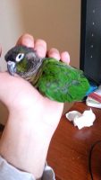 Feathers are slightly chewed (bad habit of overpreening) with slightly overgrown beak. He is very friendly and hand tamed. Has full flight feathers. His favourite treat is a piece of walnut.