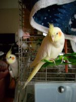 Gwennie has a bald patch under her crest, was wearing a red legband. She is approximately 10 yrs old. She has a toenail that grows slightly staight on one foot. Gwennie gets night terrors and is paler yellow on her body than her head.