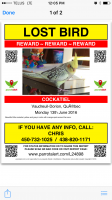 Our beautiful Cockatiel, Sunni, flew out the back door early morning on the 13th of June.