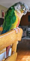 Yellow sided green cheek conure named Pesto. Has black band on his right ankle. Can provide band information and hatch certificate.