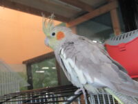 Pickles is a 3 year old male cockatiel, he is a gray cockatiel with a little bit of white on the tips of his wings, a yellow face and the mohawk is a grayish yellow, and one of his nails on his foot is stubby.