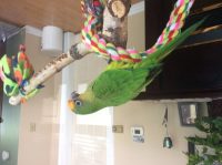 Female Peach Fronted conure. Medium sized green bird with orange forehead. Has a leg band. Please help bring Clemmy home