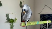 Friendliest African grey you’ll ever meet. Responds to hello, good boy, boop, and are you okay? Will step up if you say come on. Average weight, no plucking.