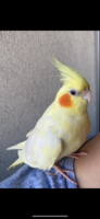 Yellow cockatiel with orange cheeks. Reddish eyes.