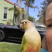 Bird is very sweet. His red tail feathers are missing. He’s green with a cinnamon head and a little red and yellow on his chest