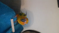 Bella is a Sun Conure estimated around 9 months old. She loves papaya treats. She is not banded unfortunately. She is more yellow but still has some green feathers around her head. She just finished molting but still has a few pin feathers. My husband and I are offering a $100 reward for her return.