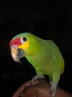 Rainbow is usually vocal, does not speak many words. Whistles and can attempt her name Rainbow. She can be shy, but can fly to someone and perch on their shoulder or head.