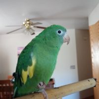 7-8 inches from beak to tail tip, is predominantly green with yellow on wings, when wings are stretched there is other coloration on wings. Unconfirmed sex, name Avalon, Avi for short. She is the typical diva bird, can’t talk but makes door whistling sounds and squeaky toy sounds and sort of a kissey noise… Mostly she just garbles in a squarky parrot language. She is a much loved family member, we want her home where she gets lots of love and attention! She has a band which starts BBF.