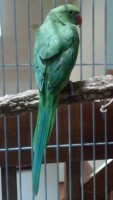 She is banded, and able to get to high places but seems to prefer to land on a man made objects more than in trees. She is green with some teal in her long tail feathers. Loves bread, may bite when scared.