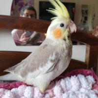 8 weeks old hand reared, still on baby food. Grey body, pied markings on head and back. Yellow face with red cheeks
