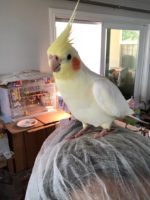 She has big eyes with bright orange cheeks. She is tame and friendly, but is scared now. She enjoys fresh foods like spinach, quinoa, egg and grains, and she may come to you.