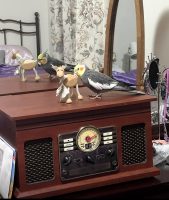 Coco Talks Coco, pretty bird, peekaboo whistles September and other whistles songs . Has a small white dot in the back of his head.