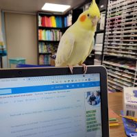 Oliver is a Lutino Cockatiel with a primarily white body, yellow head and wings, and bright orange cheeks.