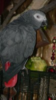Steps up nice, whistles lots and will talk much, mostly will say his name and mumble unless early in the am. Loves music and wind up boxes. Seeds, blueberries and chicken on the bone are some of his favorites. I have had him 12 years. He has full flight and is very used to dogs and cats.