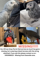 Our African Grey has gone missing, we bought him as a Congo but could be a crossbreed of a Timneh. His wearing an ankle bracelet and still has his black Harness attached to him with the string attached. He doesn’t bite and is gentle and is easily scared. He has dark wings and a bright red tail. He has just started to be vocal and chirps slightly. His eyes are just starting to get lighter and are more grey than black. He is around 4-5 months old. If you find him pleaseeeee contact us, we love and miss him dearly.