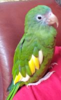 White winged parakeet with yellow mid feathers and white feathers on wing tips. Overall body is green. Charlie is very tame and will come to people if he has survived the cold. He may respond to whistles especially 3 whistles in a row. Charlie has some missing tail feathers.
