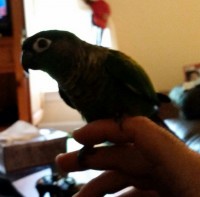 is only 13 weeks old. She got out this morning while on our first outing. She is mostly green with blue wings and red tail feathers. She is very friendly and probably landed on somebody’s head or shoulders by now. If found please notify me. chrispryor06@yahoo.com