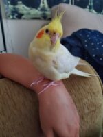 All yellow with bright orange cheeks. Will get startled by loud noises. Like corn, pistachios, and seeds. Very used to being around people and is friendly.