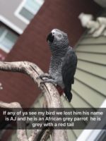 He was last seen at Cumberland garden. He is very scared please contact me or take him to ASPCA on dixon street my daughter’s and I are walking up and down the streets and alley to see if we hear him he says hello if the phone rings