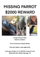 Beloved parrot Ashton Grey went missing on 11/30/22 at 5pm from Asa/Wildoak/Kleberg area or Balch Springs, TX. Reward of $3000 is being offered for the return of our baby.