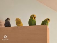 In the picture, Daisy is the second bird from the left in between the blue and green one. She is all yellow except for a slight colouration below her neck and on her upper chest. On her wings, she has some black markings.