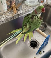 Emory has a very long very thin tail ( about 14 inches)a large bright maroon beak, a ring that looks like a black bow tie in the front with hot pink at the back of his neck, his body is shades of green, his head is iridescent green, he has maroon marking on his shoulders. When lost he was in perfect feather and a strong flier. He talks a little ( good morning , hello ) but he has a stress call that sound like a smoke alarm. If you hear a one note shrill sound like a smoke alarm PLEASE FOLLOW THE SOUND. When stressed he will scream his alarm sound repeatedly. He was last seen flying high right above Aspen Ridge off of Sims Rd. Emory is sweet , smart and very shy. He will be very curious about all the new things and he will Cautious. His favorite bribe food is almost anything but he LOVE plain low salt popcorn, He would fly to the ground for popcorn – also LOVES APPLE SLICES. He is Loved by his flock friends and by ME. Please help Lynne 281-755-7050