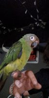 Dusky conure shy and skiddish but will step up, he is a little fiesty to unknown people but won’t draw blood, if seen just get him a bit wet so he can’t fly and he loves the water anyway